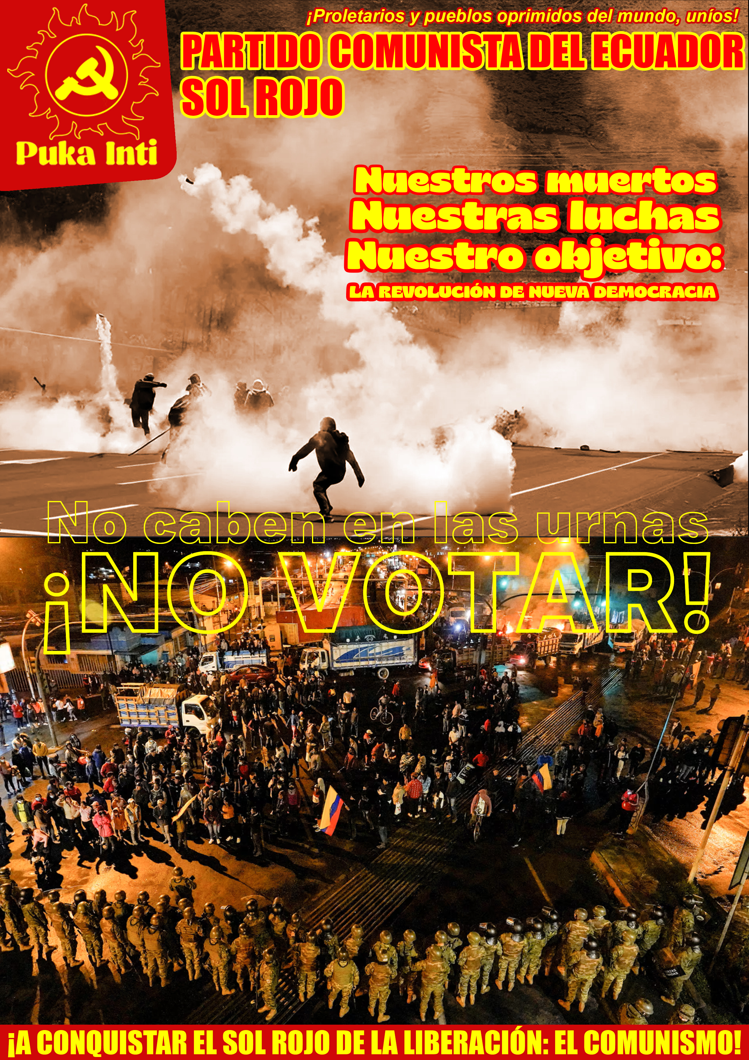 What did the people get from the 2008 Constitution? Nothing! They have exploited, oppressed, attacked, and violated us just the same; what’s more, we have drowned in blood and have been forced to migrate or die trying. Now they want to impose another Constitution on us. Will it change in relation to the previous one? Possibly in its forms, but it is not up to the proletariat, the poor peasantry, and the other exploited masses to endorse a political instrument that legitimizes the old State and presents it in its most “subtle” version in the field of government. People of Ecuador, remember: going to the polls, whether to elect authorities or for a new Constitution, only endorses the actions of all governments, particularly the last one, sustained by imperialist violence, lies, and governing in the interests of the big bourgeoisie and big landlords.
